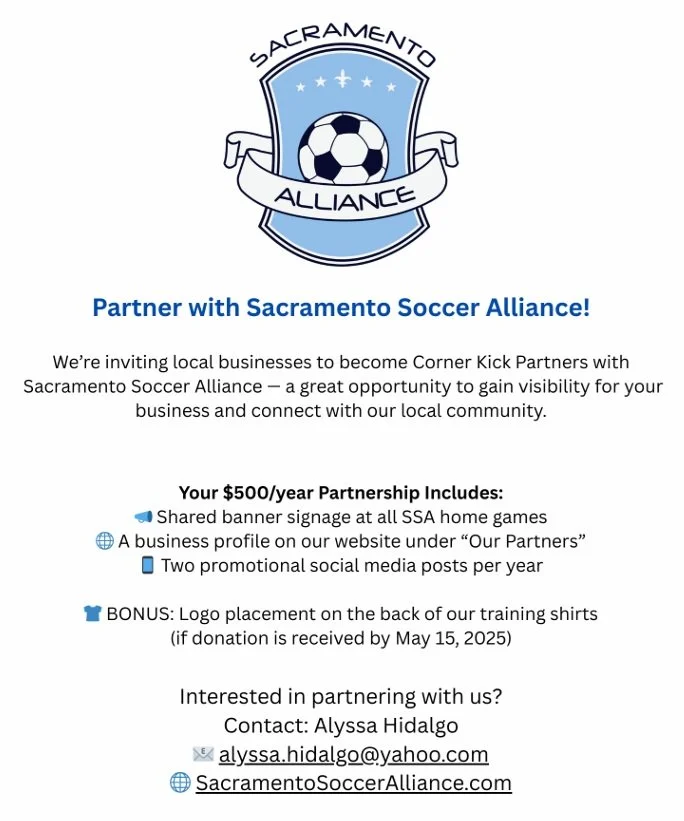 We are honored to work with other community clubs, regional leagues, and local businesses to provide the best that competitive soccer has to offer for youth in our community. If you would like to become a sponsor, please email us at communications@sacramentosocceralliance.com.